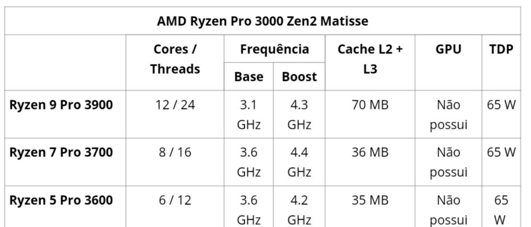 A AMD anunciou sua nova linha de processadores Ryzen Pro 3000 voltada para o público corporativo e profissional. Ao todo são oito novos chipsets, que vão desde o basicão Athlon Pro 300GE, que vem com apenas dois núcleos e quatro threads; até o topo de linha Ryzen 9 Pro 3900, um monstro de 12 núcleos e 24 threads.
