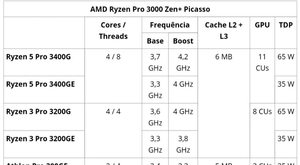 Nessa categoria, o topo de linha é o Ryzen 5 Pro 3400G, que vem equipado com quatro núcleos operando a até 4,2 GHz em modo Boost. Por outro lado, o já mencionado Atlhon Pro 300GE é o mais humilde de todos, contando apenas com dois núcleos operando a, no máximo 3,3 GHz.