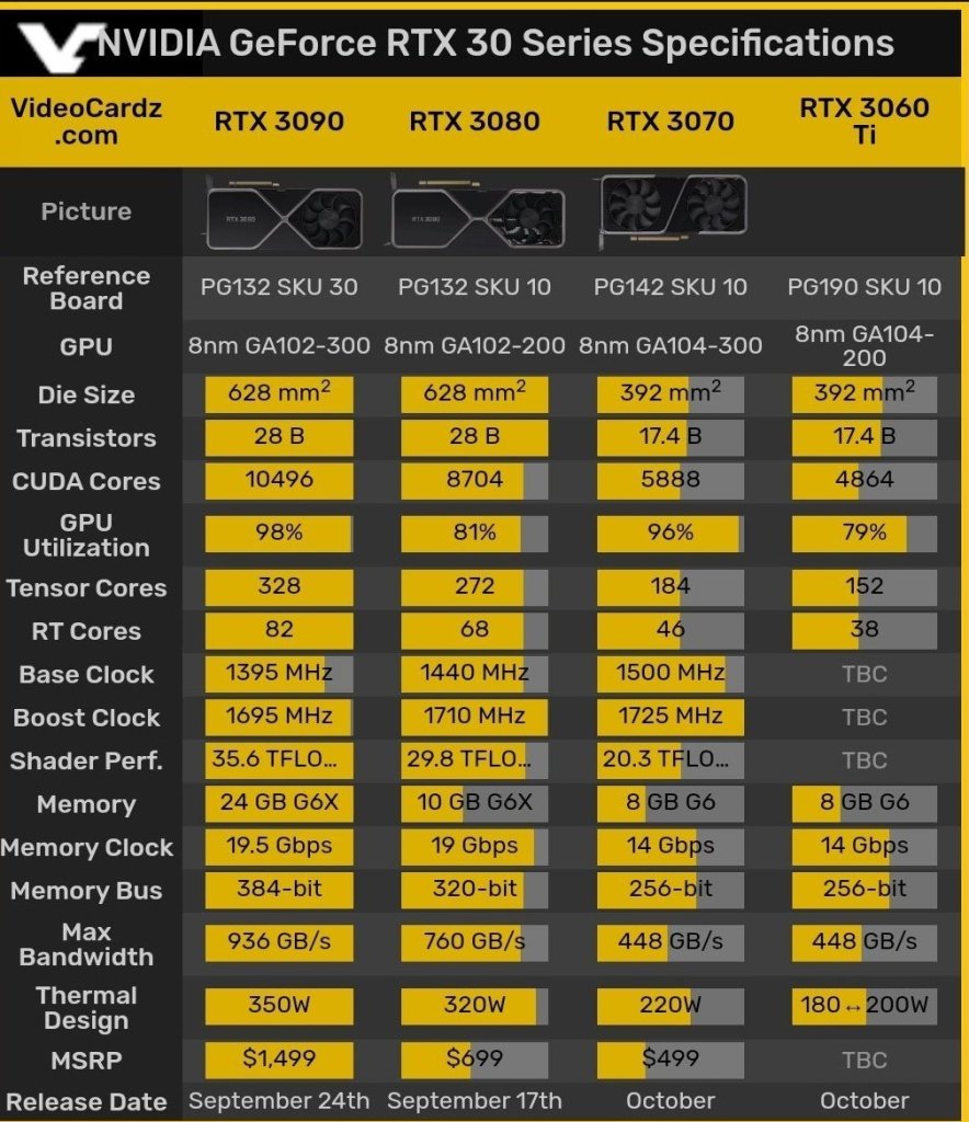 Embora a NVIDIA não tenha aumentado o preço das séries RTX xx80 e xx70 em relação à Turing, as placas de próxima geração ainda são bastante caras. Se você está no mercado para um novo modelo de gama média, então provavelmente deve esperar por outubro. Em outubro, a NVIDIA apresentará o GeForce RTX 3070, um terceiro SKU com GPU GA104 (ambos RTX 3090 e RTX 3080 são baseados em GA102). O que a NVIDIA ainda não divulgou é que também estão planejando o GeForce RTX 3060 Ti para esse mês. Nem é preciso dizer que outubro será um mês muito quente para os jogadores de desktop. Em outubro, a AMD está apresentando a série Ryzen 4000 “Vermeer” baseada na arquitetura Zen3, apenas para ‘revelar’ a série Radeon RX 6000 três semanas depois. Enquanto isso, a NVIDIA lançará suas placas de vídeo GeForce RTX 3070 e, como acabamos de saber, também a RTX 3060 Ti. A NVIDIA informou aos AIBs que o plano é lançar o RTX 3060 Ti na segunda quinzena de outubro. As especificações também foram fornecidas e parece que o modelo Ti está substituindo o suposto RTX 3060 SUPER. A GeForce RTX 3060 Ti é equipada com GPU GA104-200, apresentando 4864 núcleos CUDA (exatamente 1024 núcleos a menos que RTX 3070). Ele compartilhará a configuração de memória com RTX 3070: 8 GB de memória GDDR6 não X com clock de 14,0 Gbps (com largura de banda máxima de 448 GB / s). Em termos de consumo de energia, só temos números AIB para modelos personalizados com overclock de fábrica. Parece que o RTX 3060 Ti terá cerca de 40W menos que o RTX 3070. Os números fornecidos por nossas fontes estão todos acima das especificações de referência da NVIDIA, no entanto, comparando-os com o que já conhecemos da NVIDIA, podemos assumir que as especificações de referência do TDP para RTX 3060 Ti são algo em torno de 180W a 200W (modelos OC de fábrica). Uma placa personalizada requer um único conector de alimentação de 8 pinos, é seguro presumir que a placa de referência também requer tal conector.